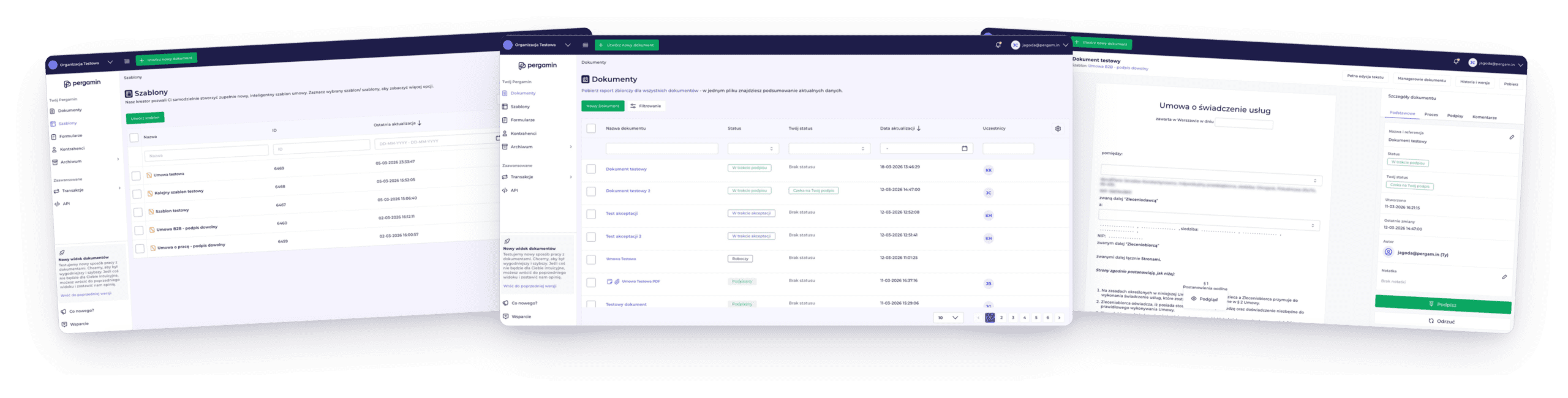 Pergamin generuje dokumenty, zbiera podpisy kwalifikowane i odkłada komplet do audit-ready obiegu. Bez ręcznego składania pakietów. Bez wymiany Twojego HRIS.