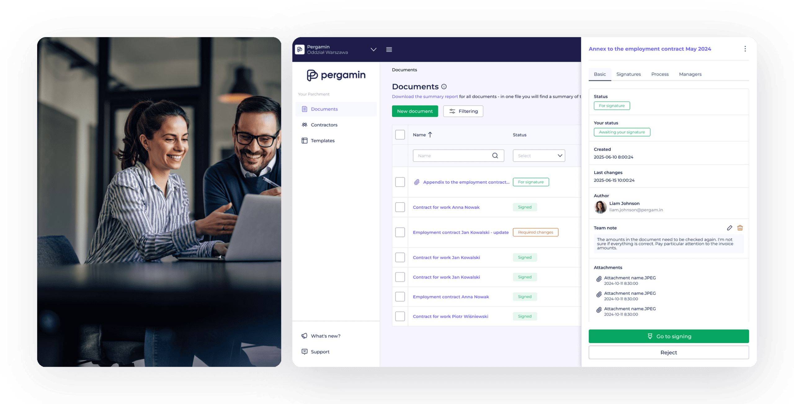 Pergamin turns employee data into Polish-compliant documents, qualified signatures, and audit-ready records – without replacing your existing HR systems.